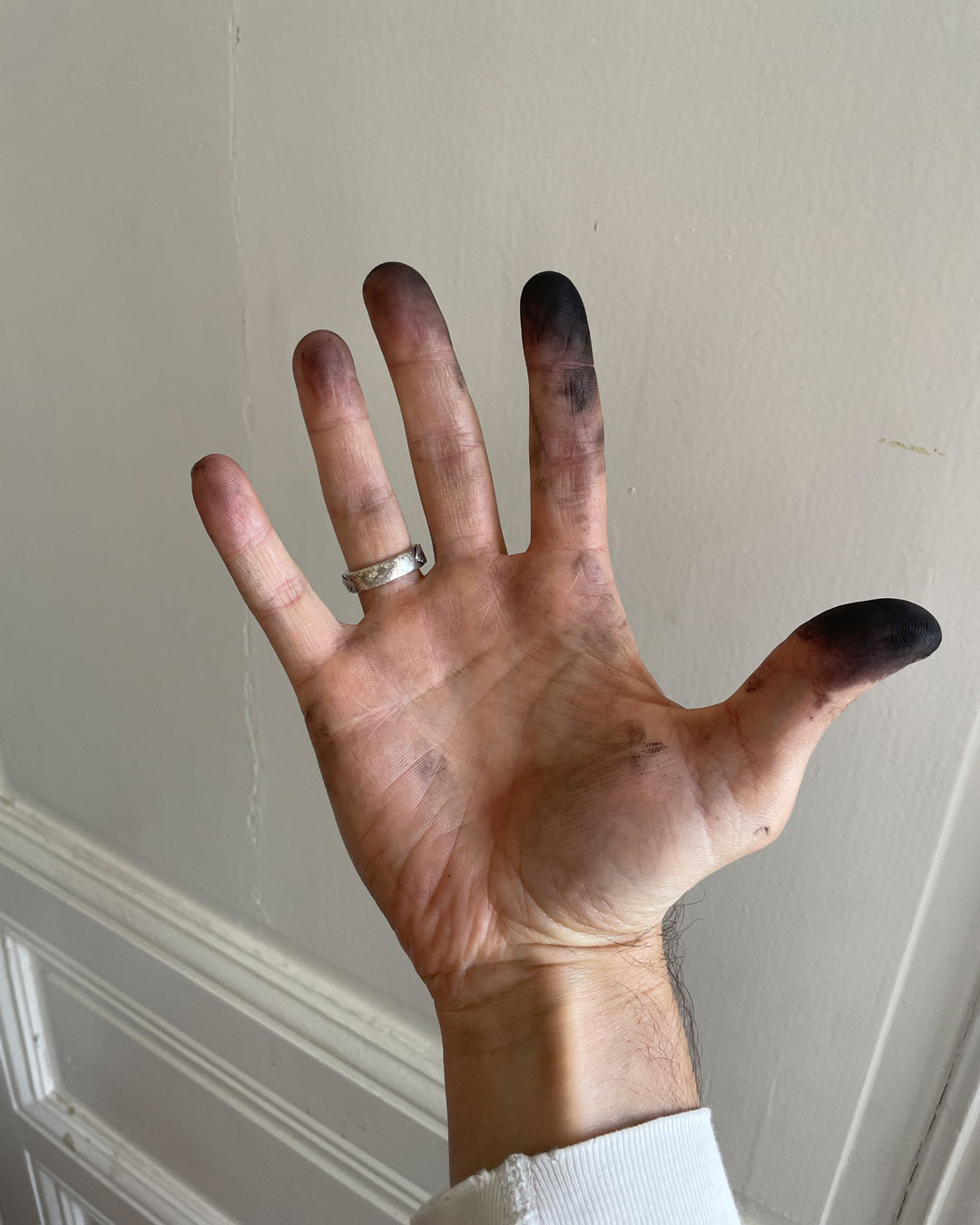 L’arrière-plan est un scan géant de toutes les poussières et éclats de craie accumulés pendant le processus, et inversé pour faire penser à un ciel nocturne, et rappeler le monde festif de la nuit.